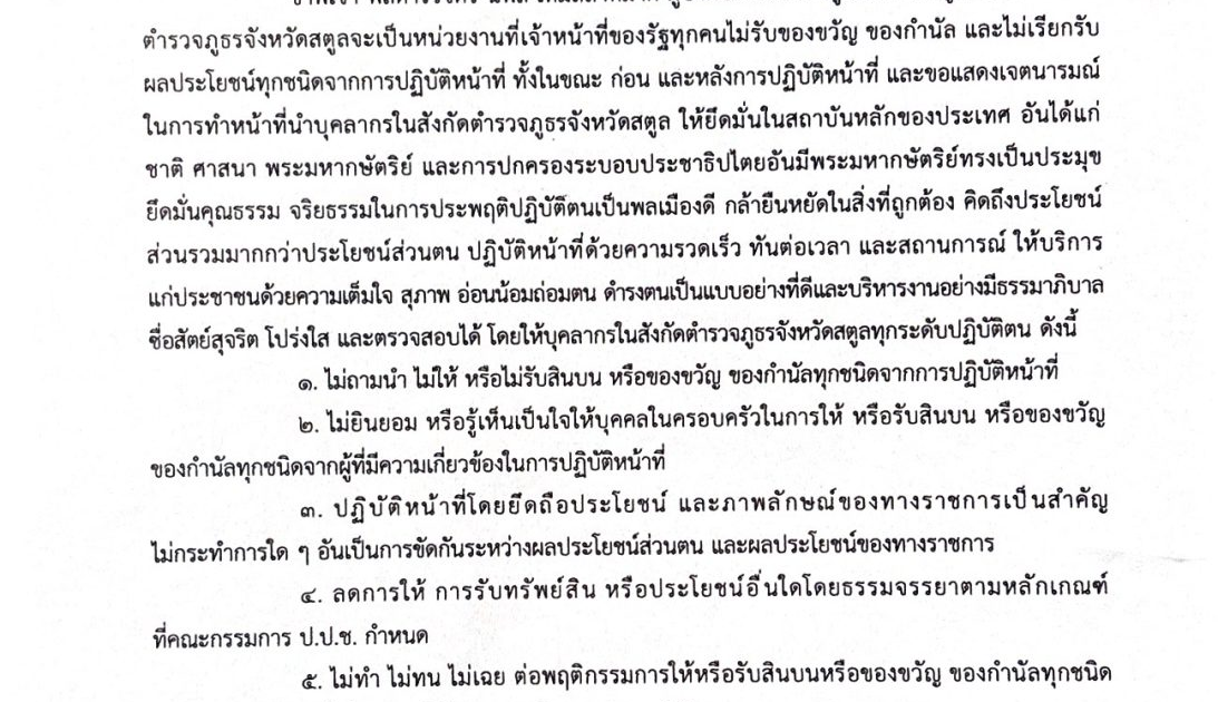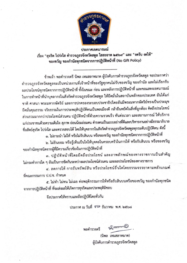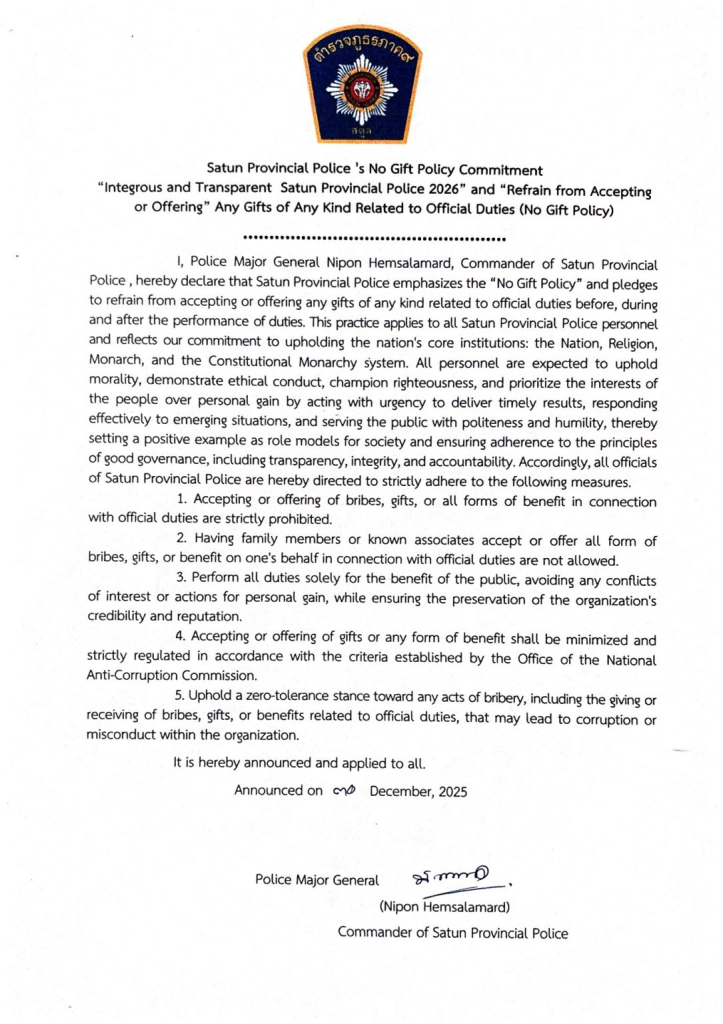 ตำรวจภูธรจังหวัดสตูล ขอประกาศเจตนารมย์ “สุจริต โปร่งใส สตูลใสสะอาด 2569” และ งดรับ งดให้ ของขวัญกำนันทุกชนิดจากการปฎิบัติหน้าที่ No Gift Policy 30 ธันวาคม 2025 โดย admin / ข่าวประชาสัมพันธ์,ข่าวกิจกรรม,ข่าวประชาสัมพันธ์ ตำรวจภูธรจังหวัดสตูล ขอประกาศเจตนารมย์ “สุจริต โปร่งใส สตูลใสสะอาด 2569” และ งดรับ งดให้ ของขวัญกำนันทุกชนิดจากการปฎิบัติหน้าที่ No Gift Policy