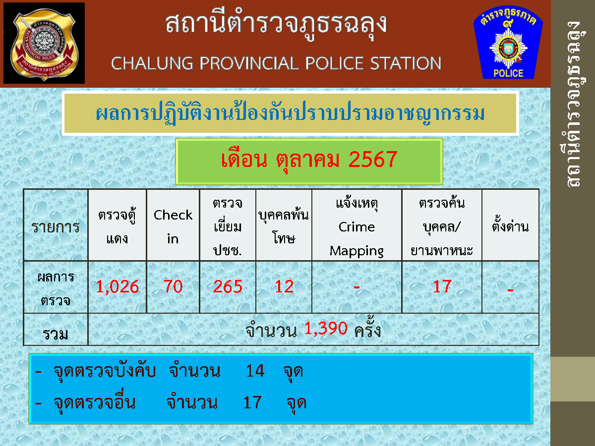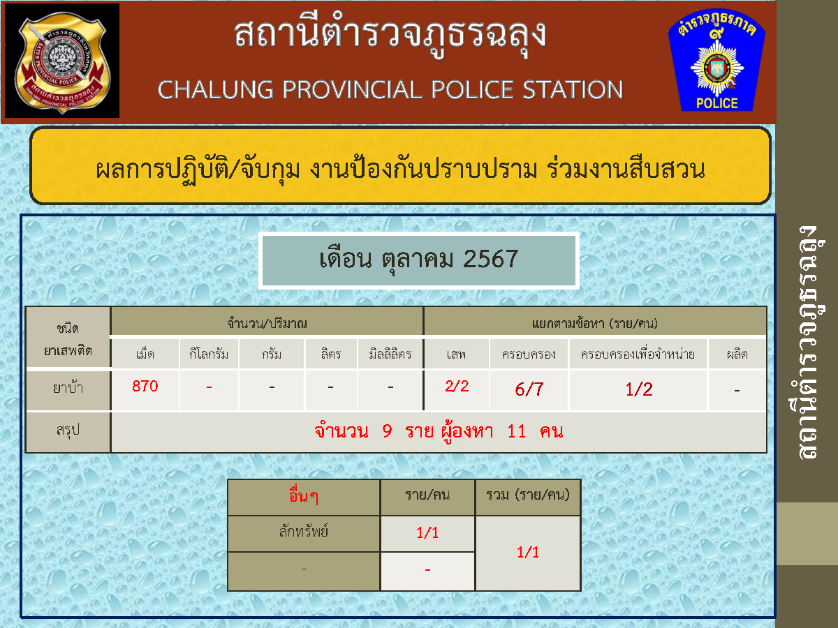 ผลการปฏิบัติงานป้องกันปราบปราม ประจำเดือน ตุลาคม 2567