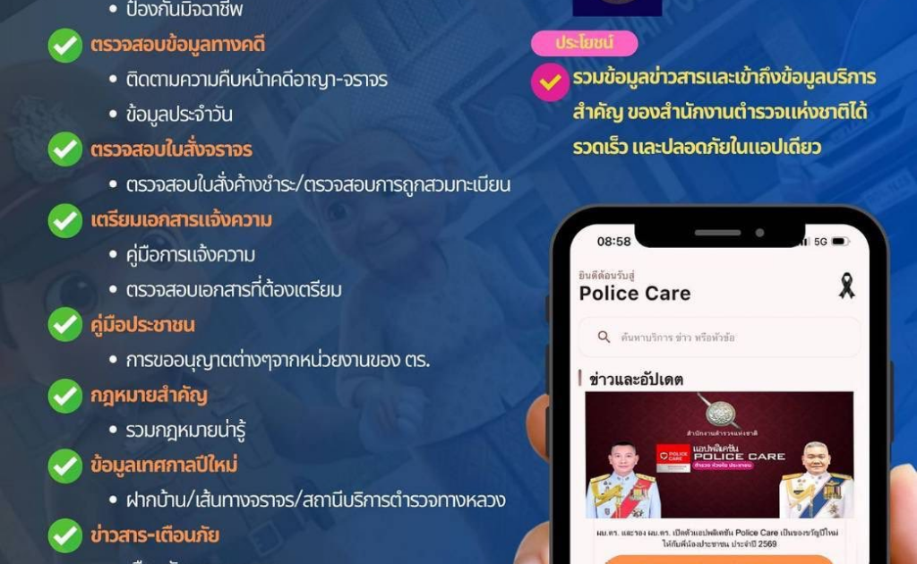 แอปพลิเคชัน “POLICE CARE” เป็นคู่มือประชาชนที่เป็นศูนย์รวมบริการ ข้อมูลข่าวสาร ติดตามผลคดี การแจ้งความ ตลอดจนข้อมูลข่าวสารเตือนภัยต่าง ๆ มาไว้ในแอปพลิเคชันเดียว โดยฟังก์ชันเด่นของแอปพลิเคชันนี้ ได้แก่ มีฟีเจอร์คู่มือการแจ้งความ, ค้นหาสถานีตำรวจ, ตรวจสอบข้อมูลคดีและใบสั่ง, ตรวจสอบตำรวจว่าเป็นตำรวจจริงหรือไม่ เพื่อป้องกันมิจฉาชีพ, ขั้นตอนและเอกสารในการไปแจ้งความ, กฎหมายต้องรู้, คู่มือการขออนุญาตต่าง ๆ และช่องทางร้องเรียนตำรวจกรณีไม่ได้รับความเป็นธรรม เพื่อให้ประชาชนอย่างเข้าถึงสะดวก เข้าใจง่าย และปลอดภัย