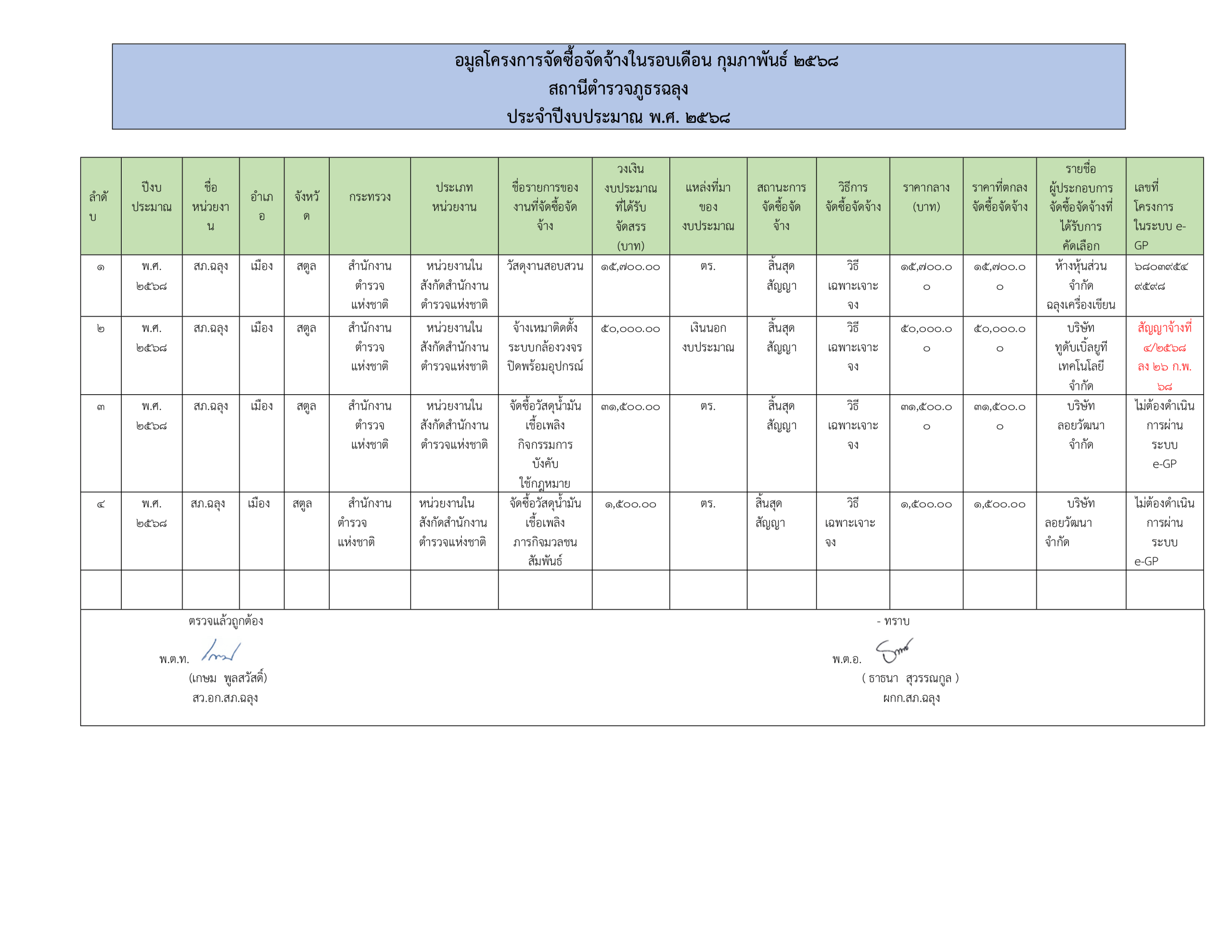 สรุปผลการดำเนินการจัดซื้อจัดจ้างในรอบเดือน กุมภาพันธ์ 2568