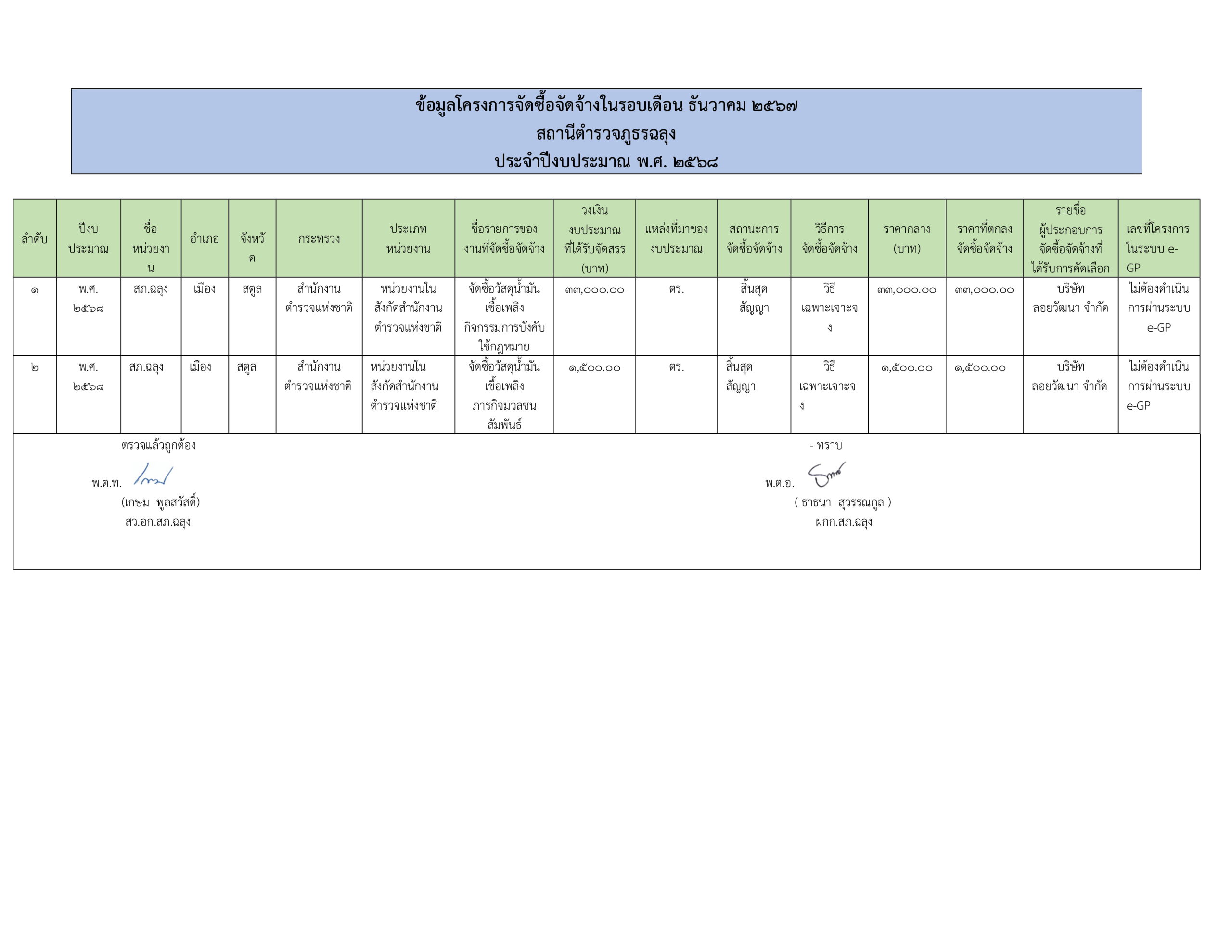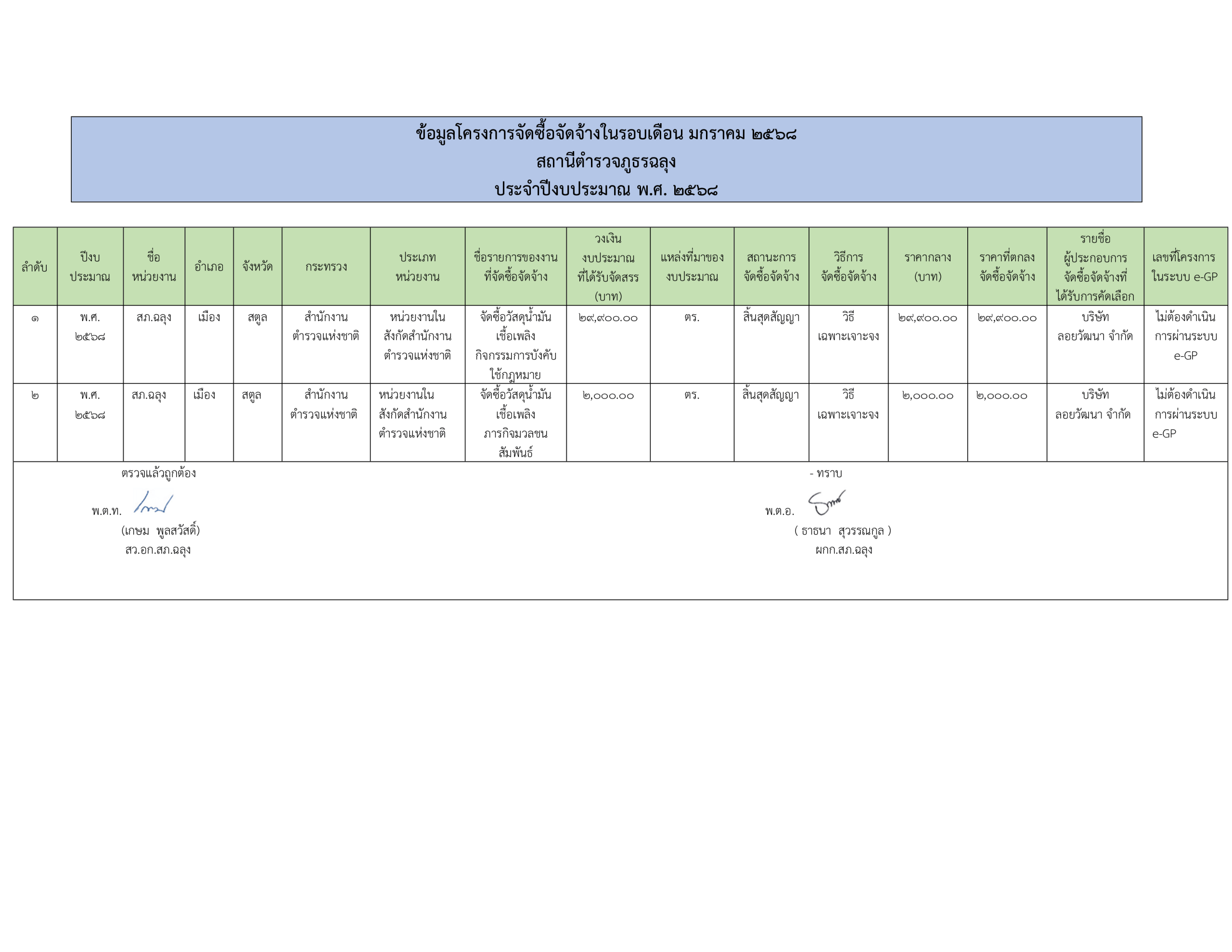 สรุปผลการดำเนินการจัดซื้อจัดจ้างในรอบเดือน มกราคม 2568