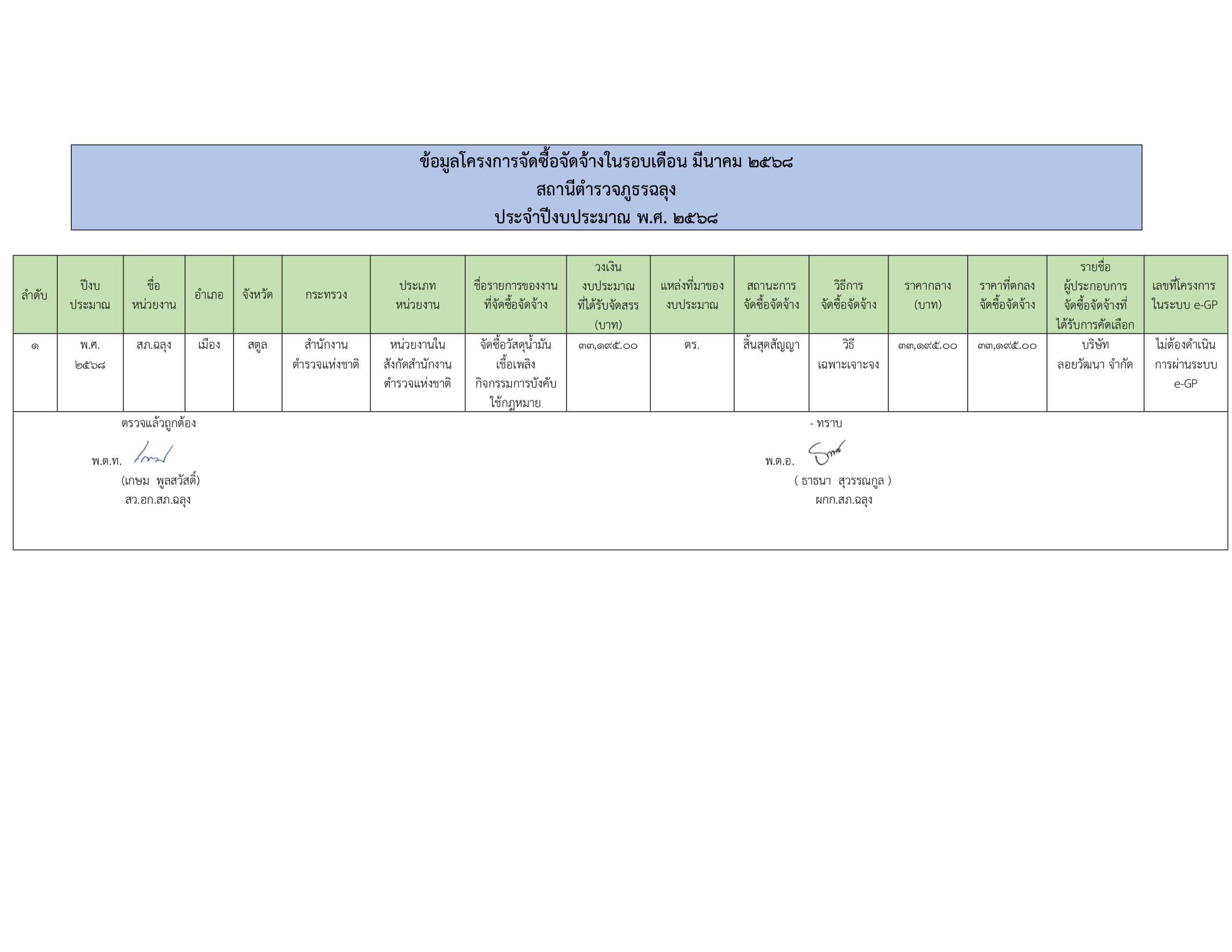 สรุปผลการดำเนินการจัดซื้อจัดจ้างในรอบเดือน มีนาคม 2568