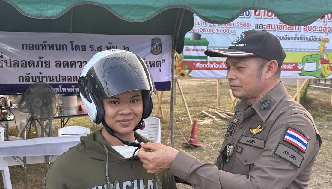 ตำรวจภูธรฉลุงแสดงสาธิตกรณีผู้ขับขี่ไม่สวมหมวกนิรภัยได้รับบาดเจ็บ
