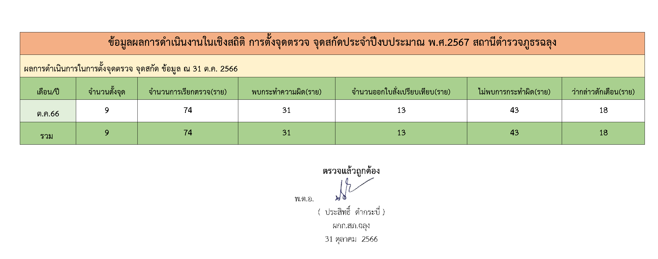 ข้อมูลผลการดำเนินงานในเชิงสถิติ การตั้งจุดตรวจ จุดสกัด เดือน ตุลาคม 2566
