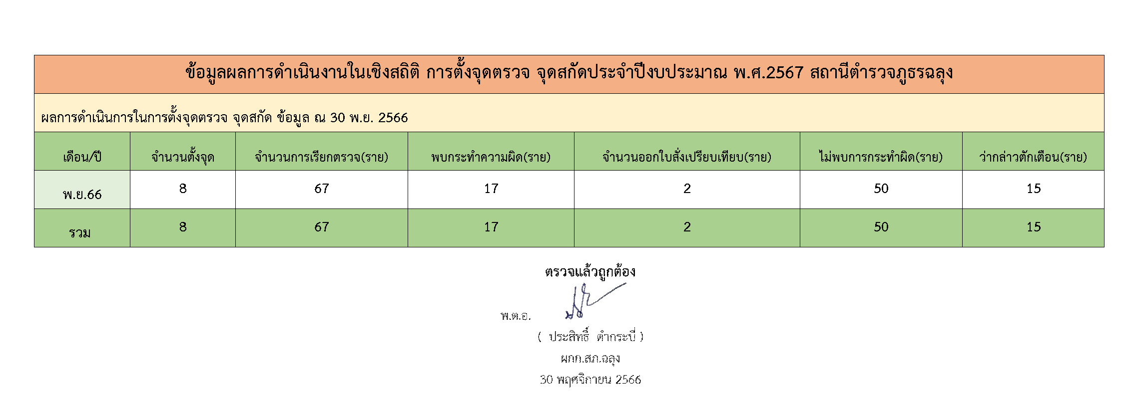 ข้อมูลผลการดำเนินงานในเชิงสถิติ การตั้งจุดตรวจ จุดสกัด เดือน พฤศจิกายน 2566