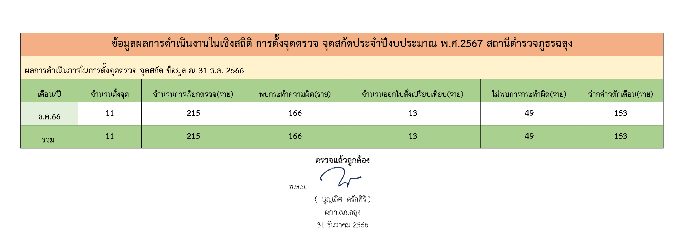 ข้อมูลผลการดำเนินงานในเชิงสถิติ การตั้งจุดตรวจ จุดสกัด เดือน ธันวาคม 2566