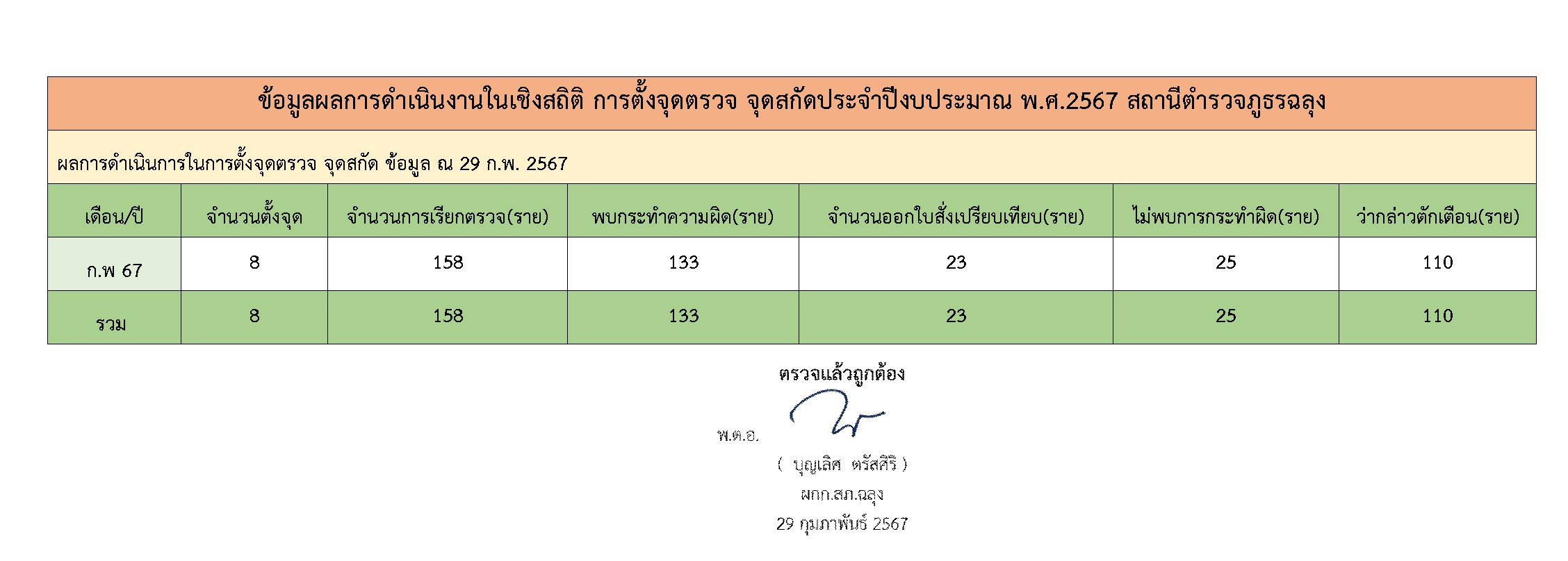 ข้อมูลผลการดำเนินงานในเชิงสถิติ การตั้งจุดตรวจ จุดสกัด เดือน กุมภาพันธ์ 2567
