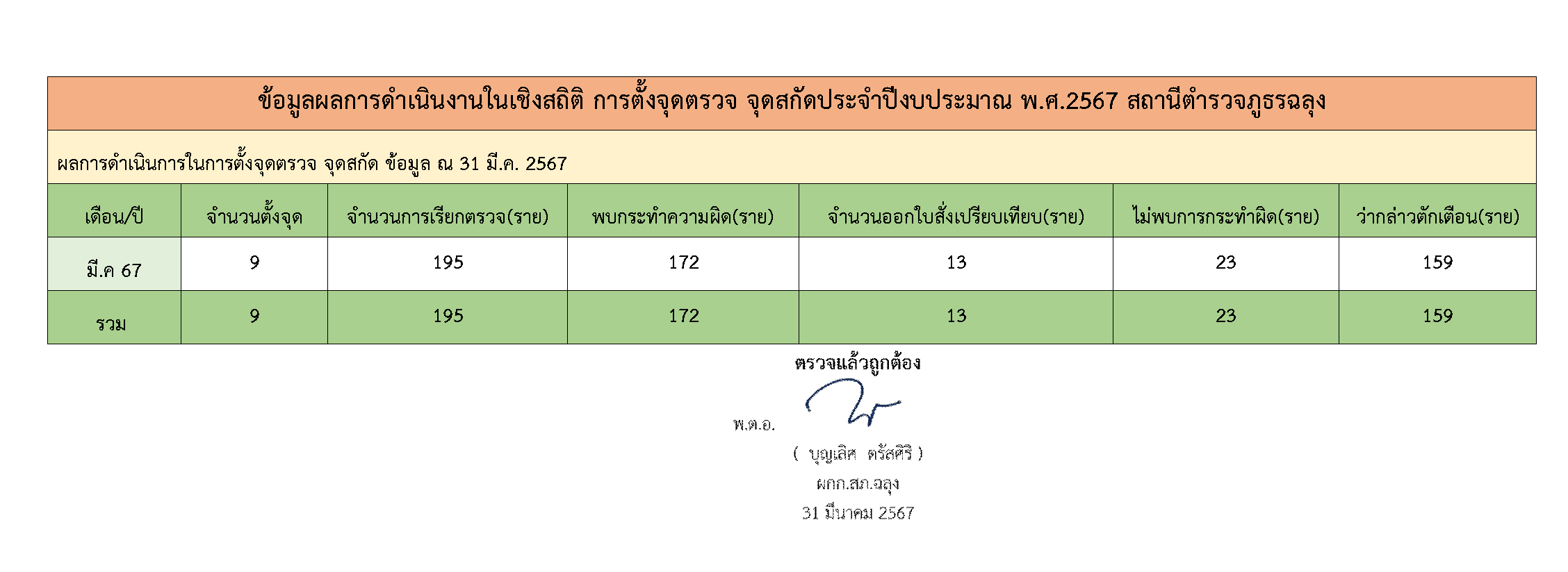 ข้อมูลผลการดำเนินงานในเชิงสถิติ การตั้งจุดตรวจ จุดสกัด เดือน มีนาคม 2567